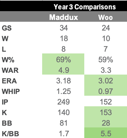 The above chart shows a side by side comparison of Greg Maddux vs Bryan Woo in their 3rd MLB Season