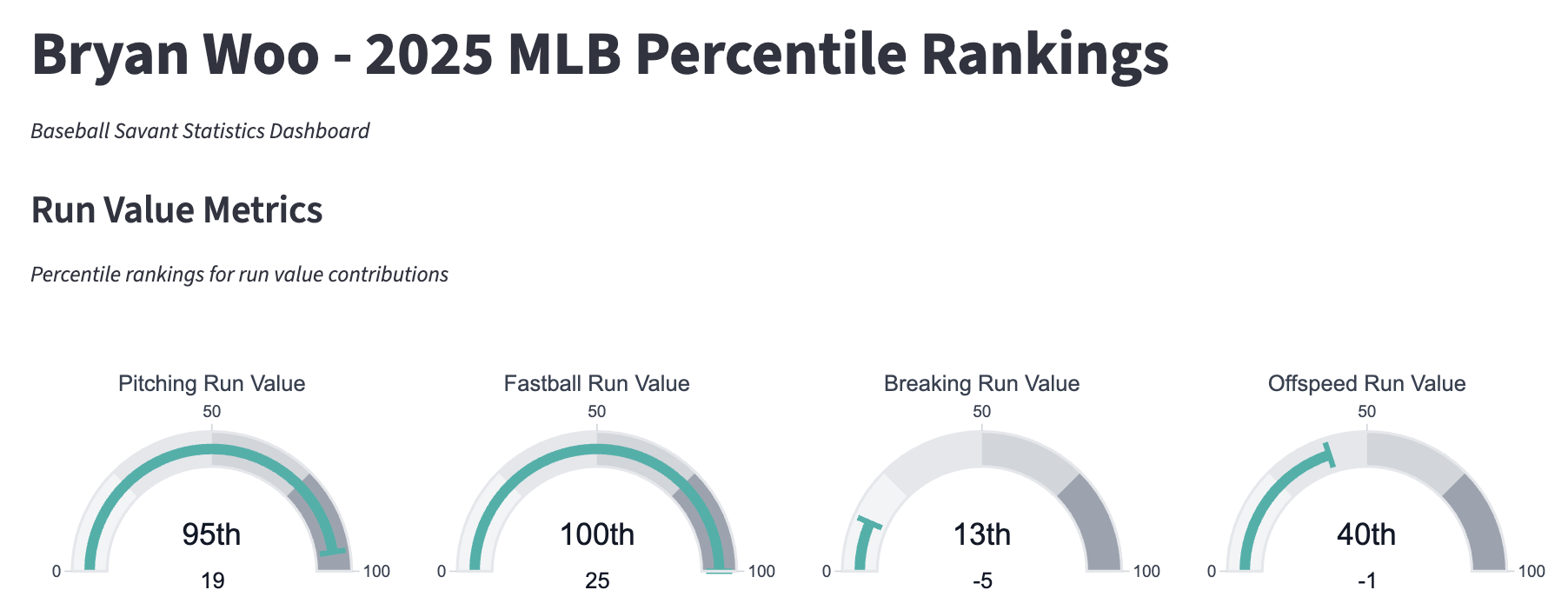 Foolish Baseball gave us a great breakdown on YouTube detailing Woo’s rise from the ashes after a seemingly mediocre college career at Cal Poly—that ended with a 6.49 ERA and surgery in 2021—to a dominant starting pitcher heading into the 2025 MLB season. To put it perhaps too simply, Woo’s arm angle and low release point make up for his seemingly average numbers, particularly his sub-par spin rate on breaking balls and solid, but not elite velocity. But where he appears to lack in some areas, he shines brighter than nearly everyone in others.