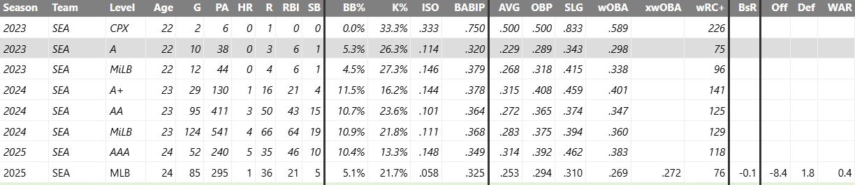 Emerson was outstanding at every level of the minors last season. He posted a 125 wRC+ in High-A, then improved to a 133 wRC+ in the more difficult offensive environment of AA Arkansas. In his brief six game stint in AAA Tacoma, he hit .364/.444/.727 with two doubles and two home runs. This is an extremely small sample size, but he showed no signs of being overwhelmed.