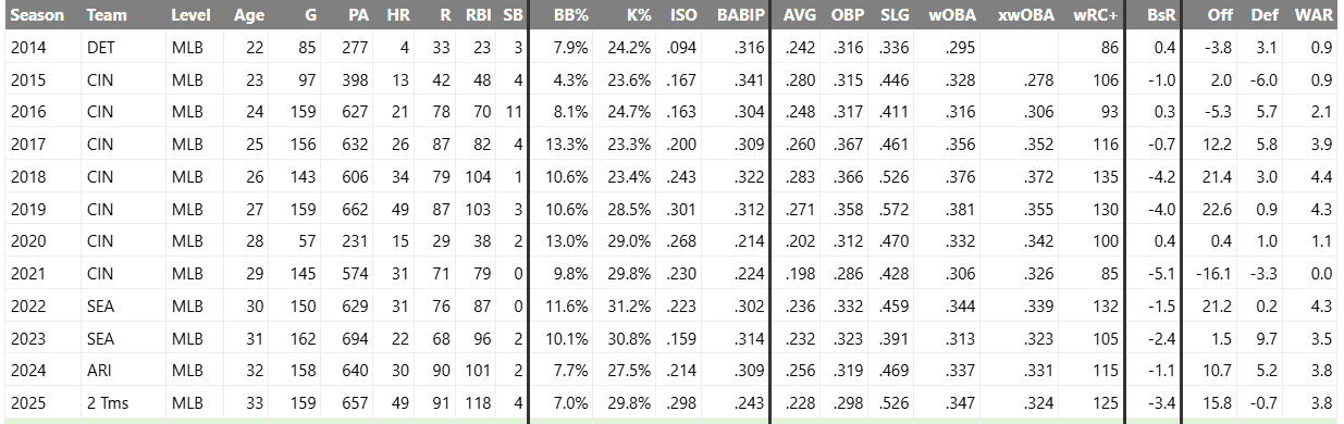 You love Geno, I love Geno, everyone loves Geno. He is one of the most likable players in baseball, a beloved teammate, and a genuinely positive clubhouse presence. His on-field production has also been strong for most of his career. He has averaged 32 home runs per season, played reliable defense, and shown remarkable durability. Since 2016, excluding the shortened 2020 season, he has never started fewer than 143 games. He seemed to find his offensive rhythm again this past year, tying his career high in home runs (49) for the first time since his age-27 season in 2019. Now 33 years old and coming off an excellent offensive season, Suarez would be a great one-year addition to help push Seattle over the top.