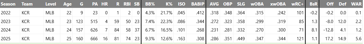 Garcia is less established but highly intriguing. He broke out in 2026 and produced a 5.6 fWAR season after previously being an unremarkable player. His improvements appear sustainable and he offers great defensive versatility. He is now entering arbitration, and although the Royals have been gradually increasing payroll, they still operate within tight limits. With several players in line to get big pay bumps in arbitration, many Royals fans fear they may be forced to move someone. Kris Bubic is the most obvious choice, as he is close to free agency, but Garcia would bring back a stronger return than Bubic and is projected to receive a larger arbitration salary. This creates a realistic path for a trade.