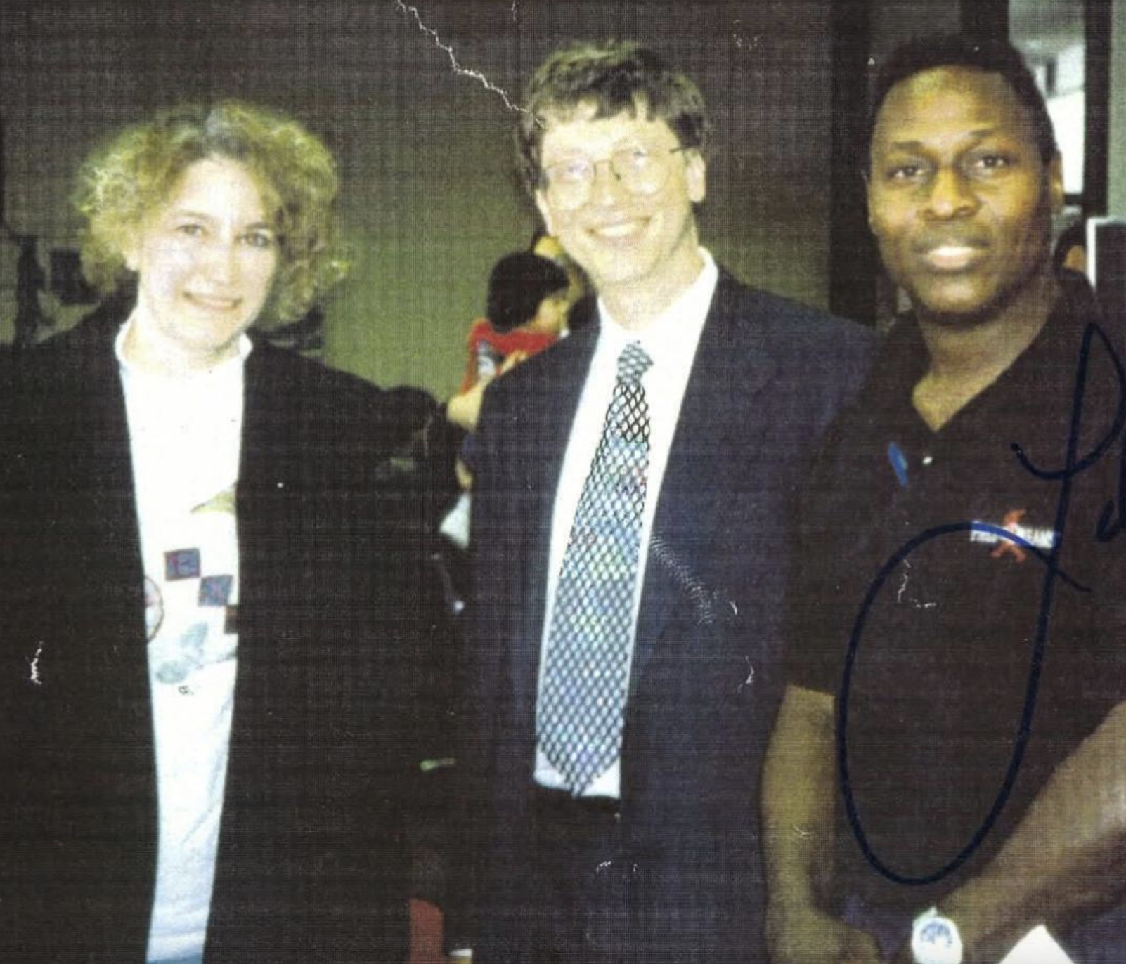 My dad brought a copy of the photo home, and my mom immediately remembered taking it. She said she thought Lenny was just an excited fan who wanted a picture with Bill Gates. At the time, she was working at Microsoft and traveling for a company trip, coincidentally on the same flight as Bill Gates. When Lenny asked for a photo, my mom offered to take it. Lenny, of course, insisted she be in it too.