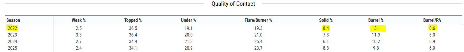 The swing rate on pitches in the zone in 2022 is particularly telling when combined with the chase rate, as it means that he laid off certain pitches even if they were strikes, as opposed to his more recent years, where he laid off fewer pitches both inside and outside the zone. Not swinging at strikes seems like a bad idea, but not all pitches in the zone are created equal. There is a concept in baseball of the “pitcher’s pitch”— a two seamer away that comes back at the last second to just barely clip the zone, or a slider that just dots the inside corner. Every hitter also has a “hole” in their swing, which is just a part of the zone they have trouble getting the barrel to. If a pitcher’s pitch happens to land in that area, it is even more effective. Swinging at pitcher’s pitches generally doesn’t go well for batters, because they will miss a lot, or generate an easy out via weak contact.
