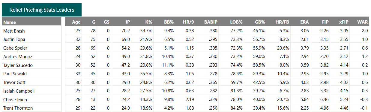 2023 BP: 548 innings pitched, 3.48 ERA (4th in MLB), 3.80 FIP, 1.26 WHIP, 5.3 fWAR. The six guys with the most innings were: Matt Brash, Justin Topa, Gabe Speier, Andres Munoz, Tayler Saucedo, and Paul Sewald. None of them were established relievers before joining the Mariners organization.